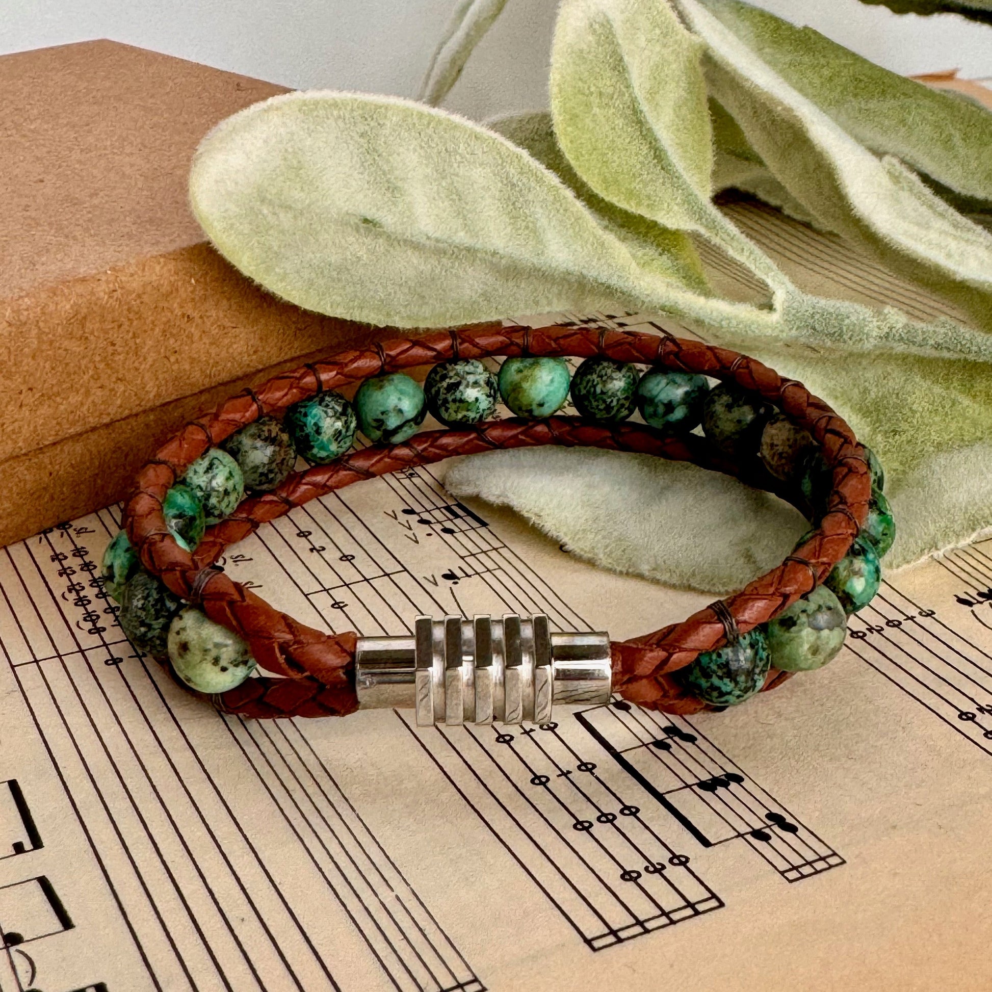 This 8mm bracelet showcases African Turquoise beads and a braided leather design, adding a touch of elegance to any jewelry collection. The stainless steel magnetic clasp allows for easy wear and removal.