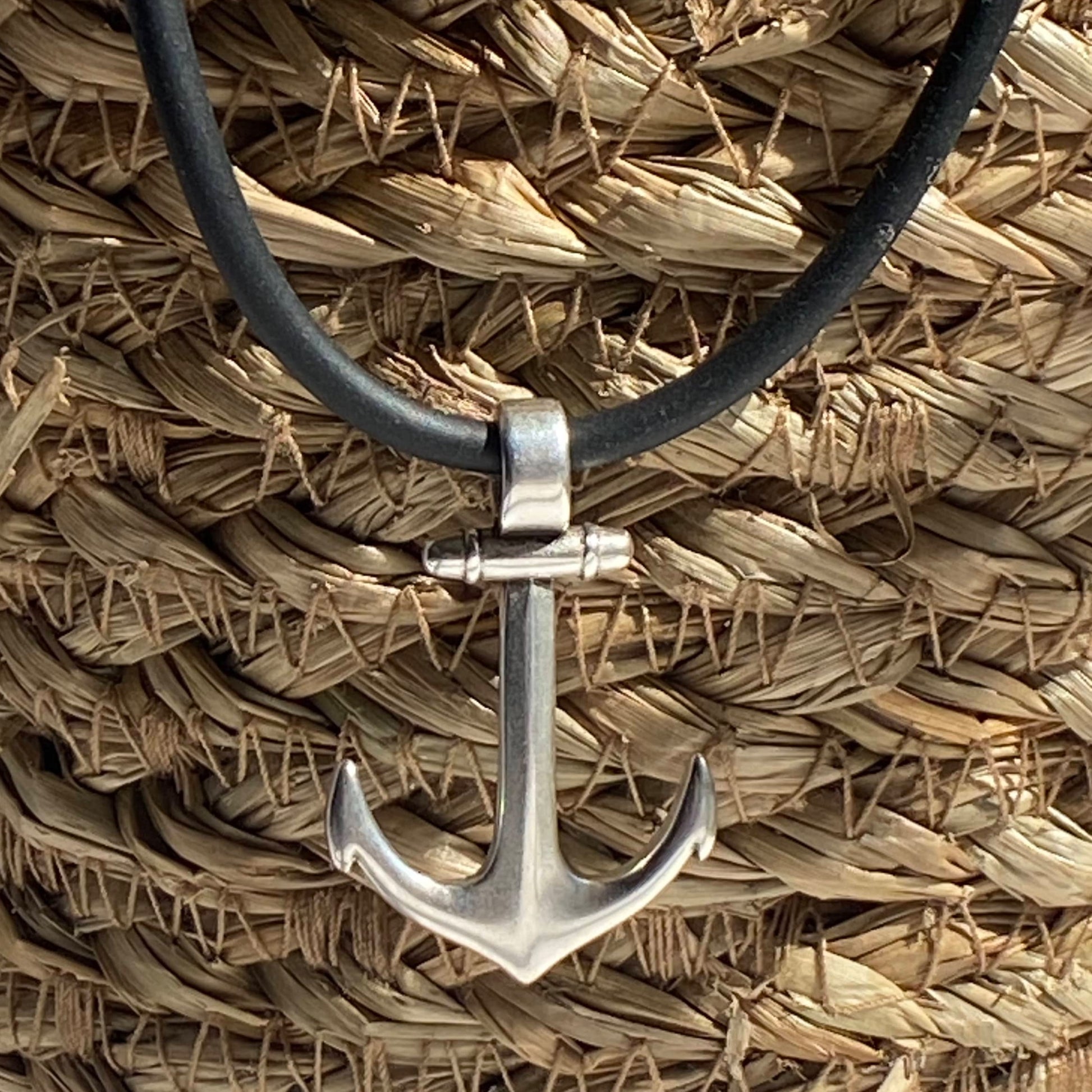 This Anchor Pendant Necklace is zinc-plated with 99.9% sterling silver and has an antique silver finish. It measures 1.25 inches and is set on a black rubber cord. This stylish necklace looks great when worn alone or with other necklaces, and is available in 16, 18, and 20-inch sizes.