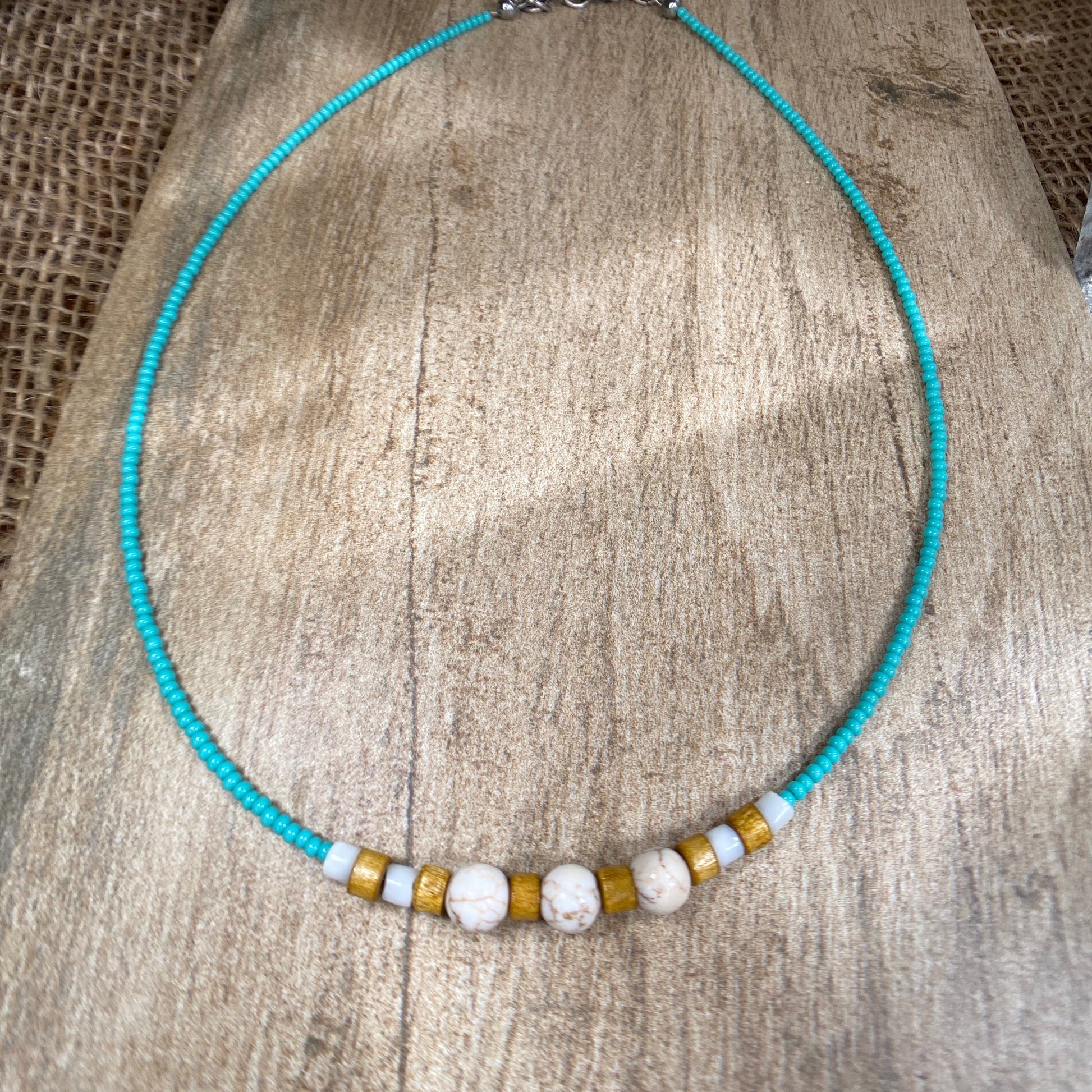 This beaded choker necklace features turquoise seed beads with white turquoise and wood beads. An antique silver lobster clasp ensures a secure fit, making it an incredibly reliable accessory. Perfect for solo styling or multi-strand layering, it's an ideal summer accessory. Available in assorted lengths, it's a must-have item.