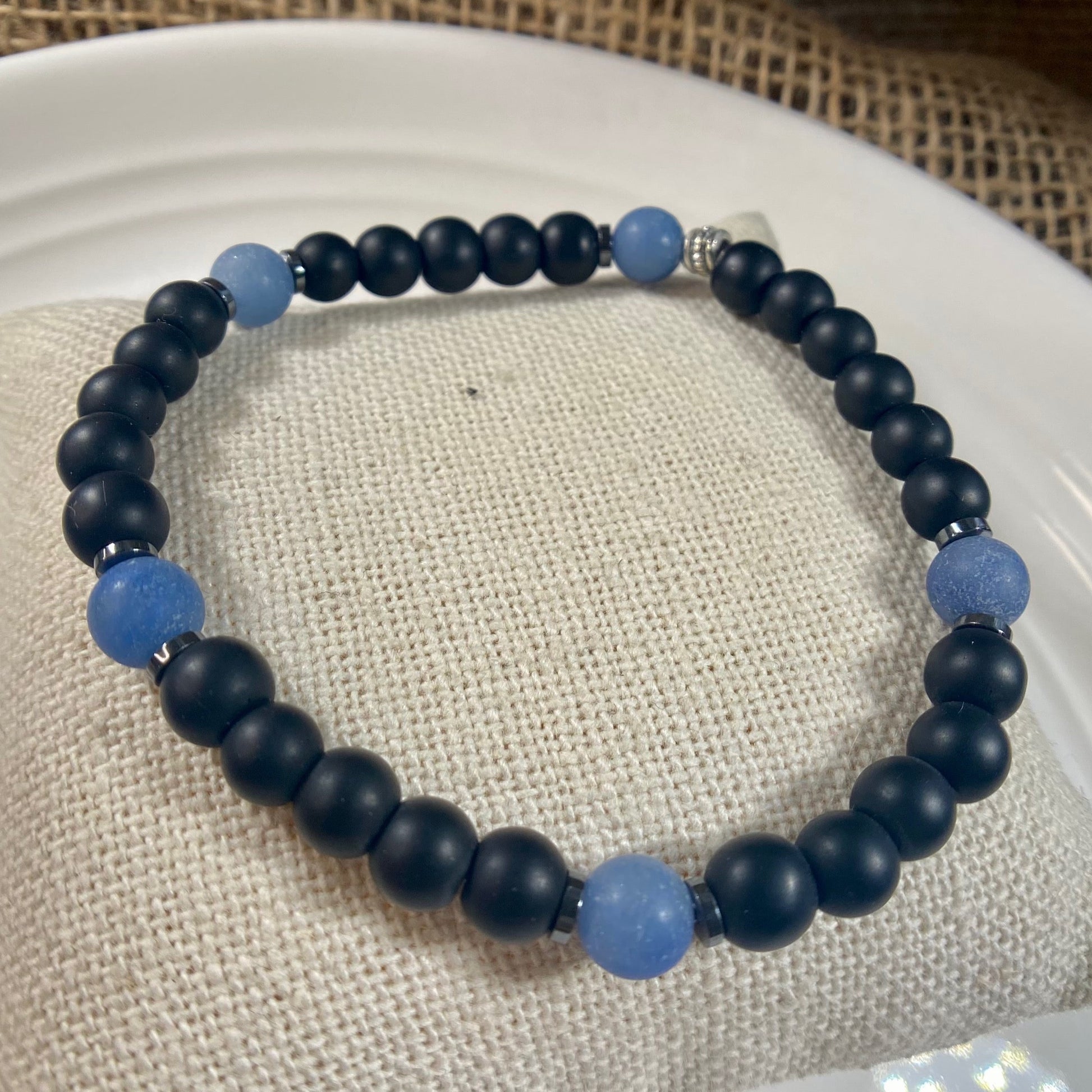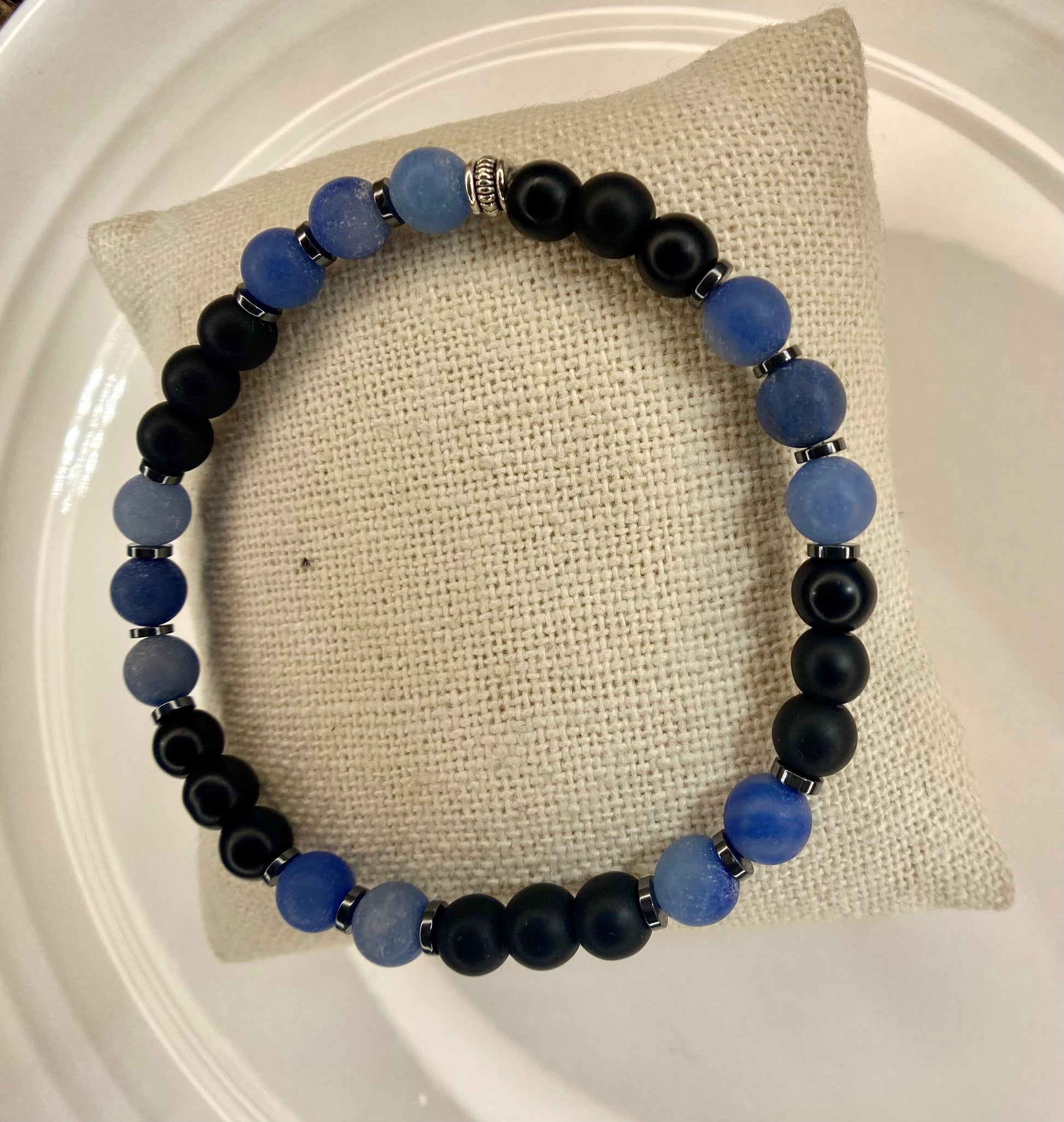 Feel the urban vibes of this 6mm beaded stretch bracelet pairing matte black onyx with matte blue aventurine. Create your signature stack with other styles featuring more blue aventurine— shop my other items now!