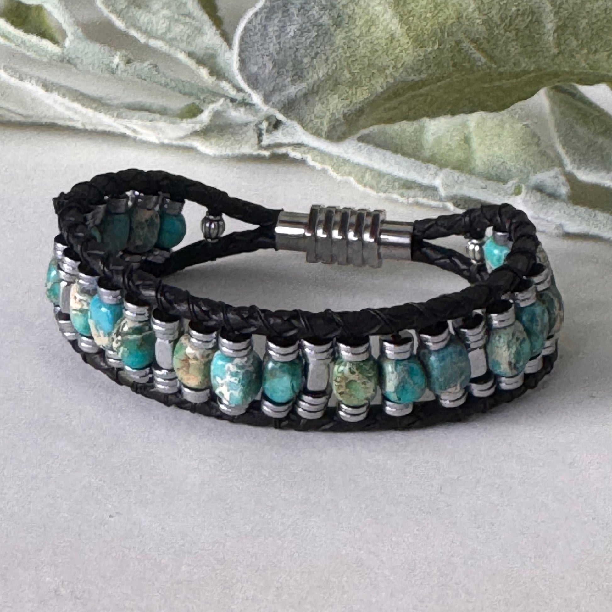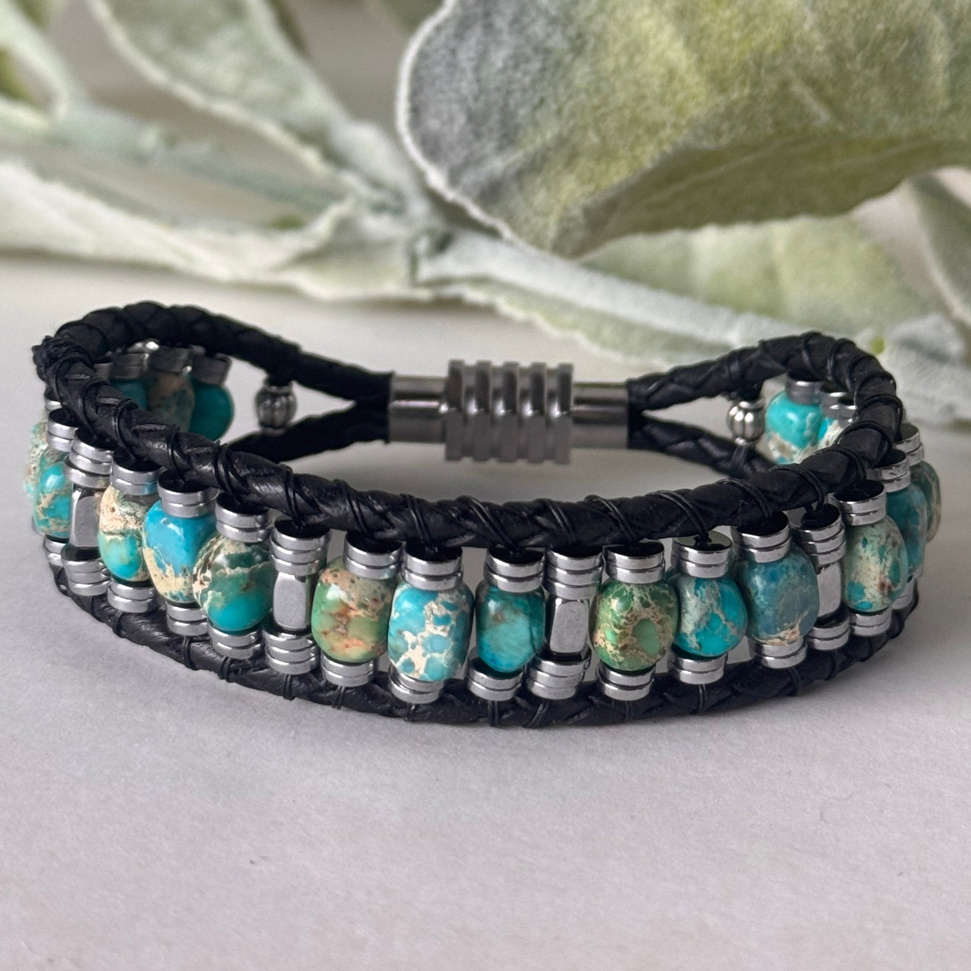 Earth Meets Sea: Sea Sediment Jasper and Hematite Bracelet on Black Leather Magnetic Clasp