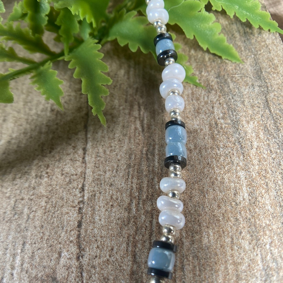 This beaded choker necklace features premier "E" beads in a light blue color. This combination of light blue and white beads will definitely draw some attention. An antique silver lobster clasp ensures a secure fit, making it an incredibly reliable accessory. Perfect for solo styling or multi-strand layering, it's an ideal summer accessory. Available in assorted lengths, it's a must-have item.