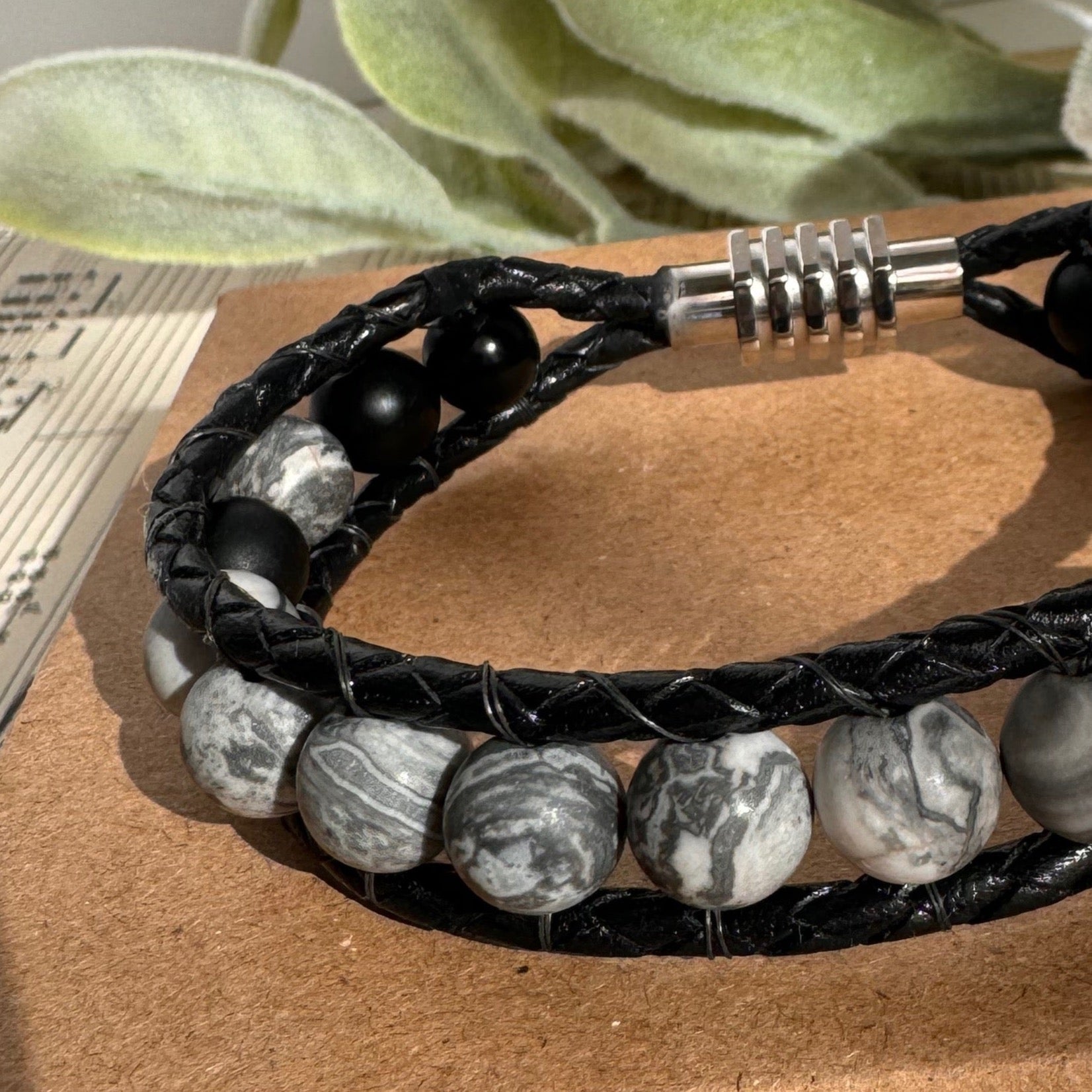 Elevate your accessory game with our Matte Grey Crazy Lace Jasper bracelet. Featuring a stylish black braided leather design and 8mm beads of jasper and onyx, this piece exudes sophistication. The stainless steel clasp offers both convenience and strength for a secure and stylish look.