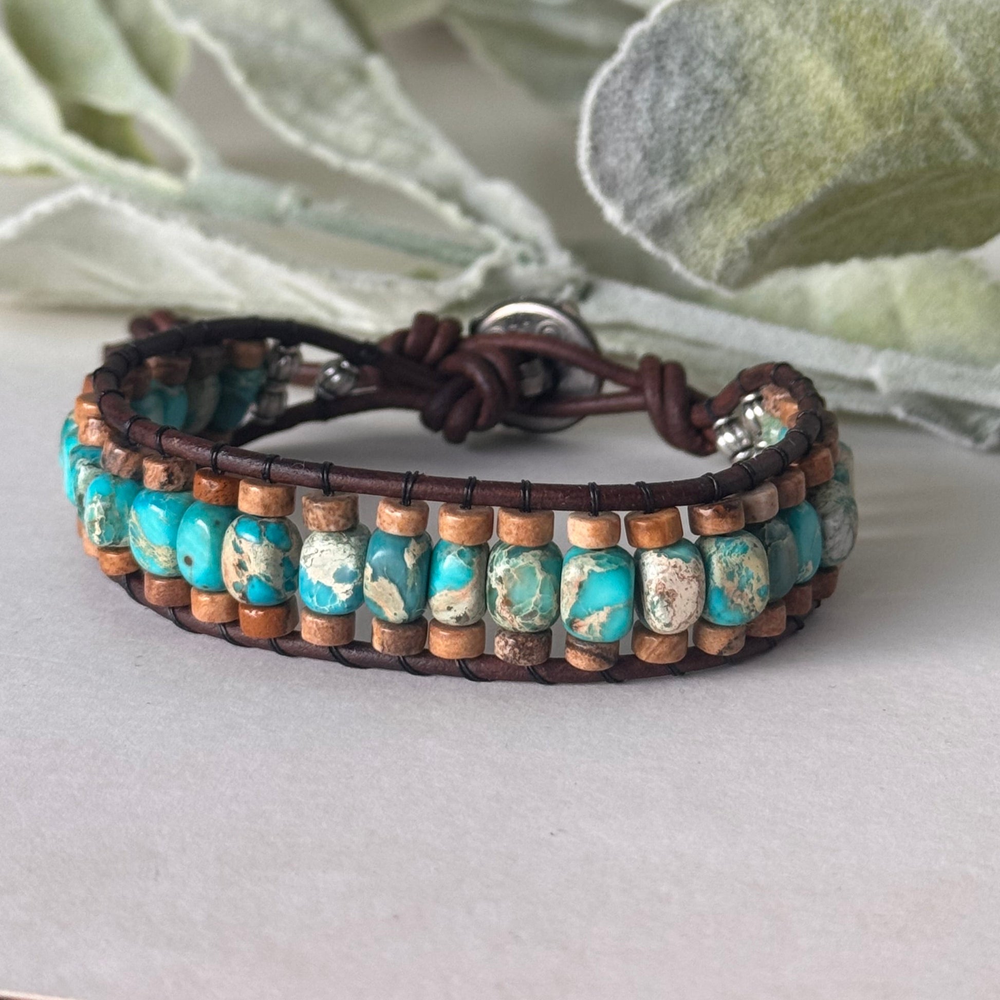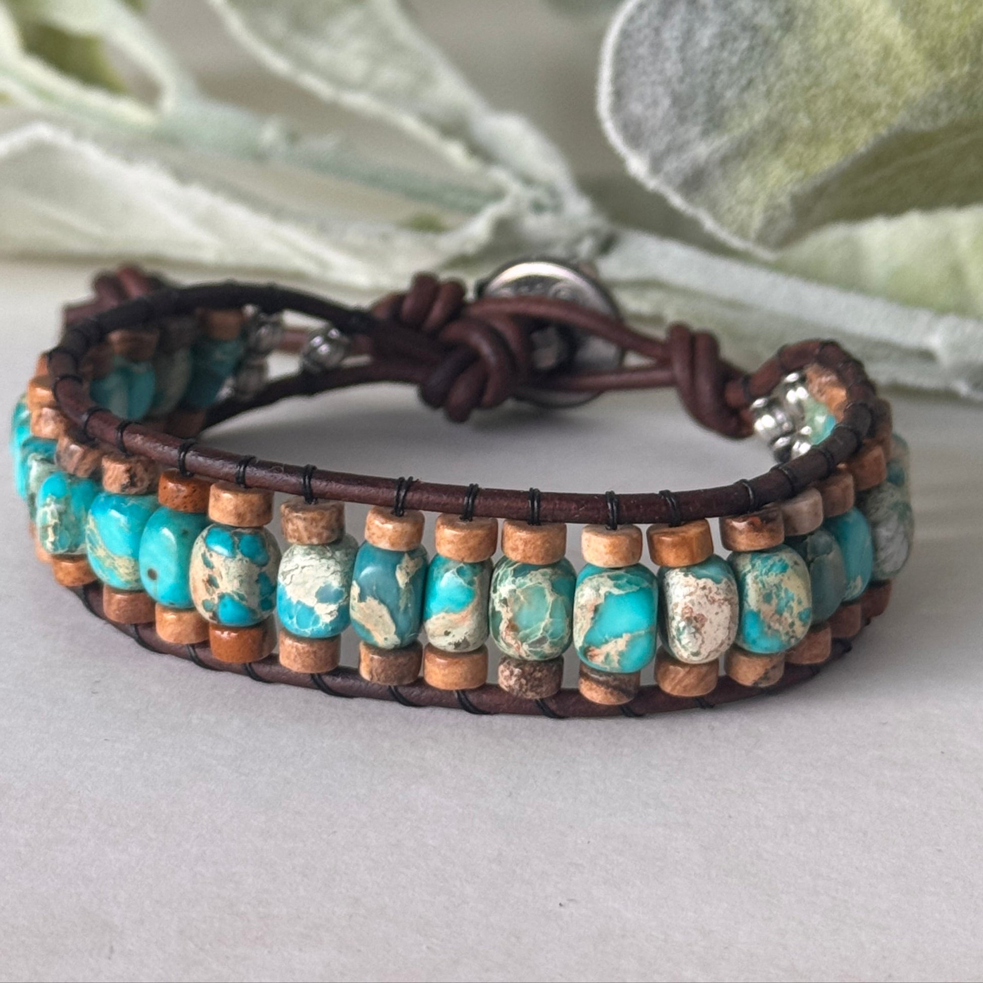 The "Earth & Ocean Harmony: Picture Jasper and Sea Sediment Leather Wrap Bracelet" is a men's beaded bracelet handcrafted by Mad Daisy Jewelry in the United States. The bracelet features turquoise colored Jasper gemstone beads, with a main stone width of 5 mm and a length of 7 mm. The beads are strung on a brown leather cord, adding a touch of rustic charm to the overall design. This unique piece combines natural elements with a stylish beaded look, making it a standout accessory for any man's wardrobe.