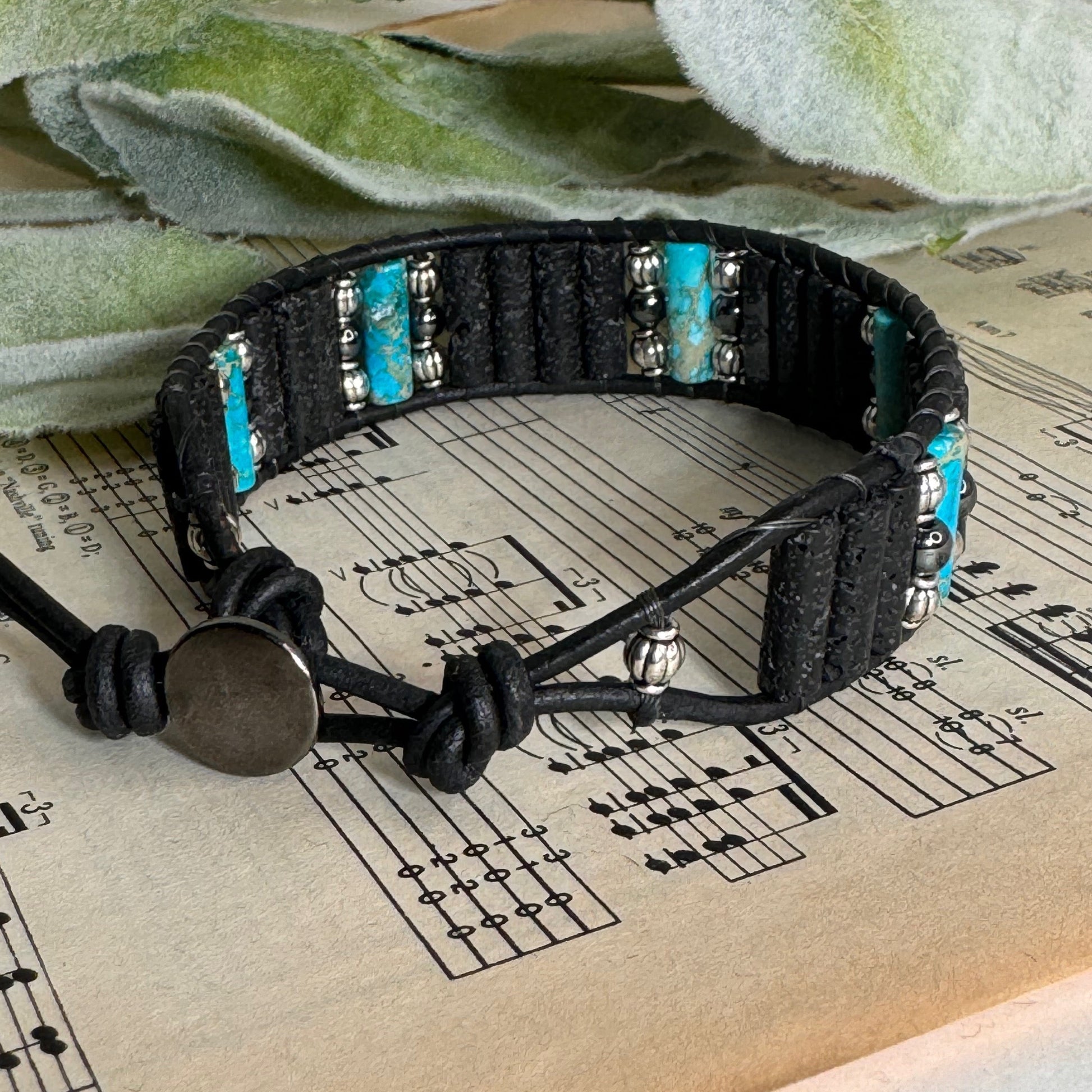 Indulge in the essence of earthy elegance with our handcrafted Beaded Leather Bracelet. Featuring a harmonious fusion of Black Lava Beads, Sea Sediment Jasper, Hematite, and Silver accent beads, each piece is a unique testament to natural beauty. With adjustable loops and a secure button clasp, it's a versatile adornment perfect for every occasion. Elevate your style with a touch of timeless sophistication.