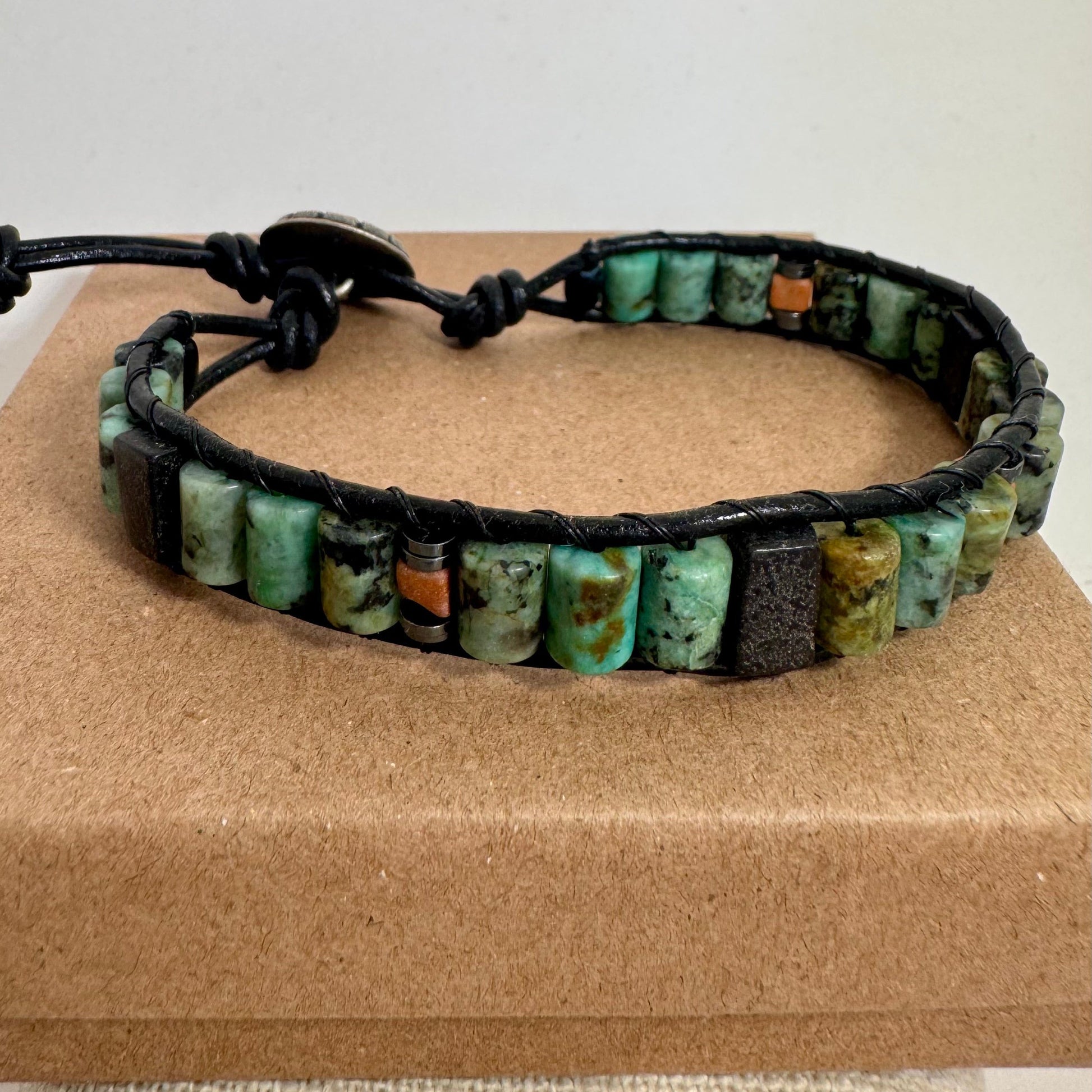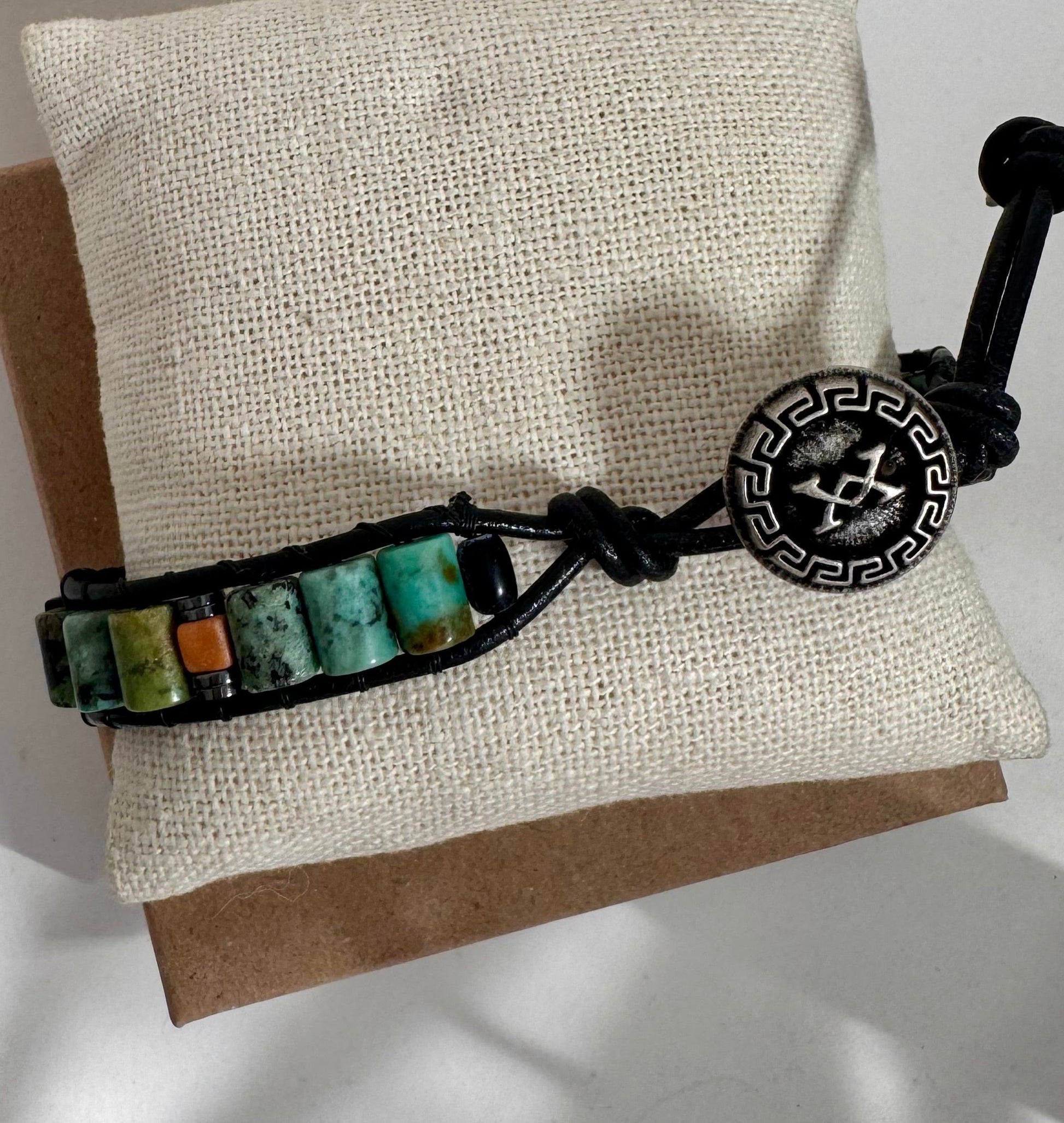 African Turquoise and Black Stone Beaded Black Leather Bracelet