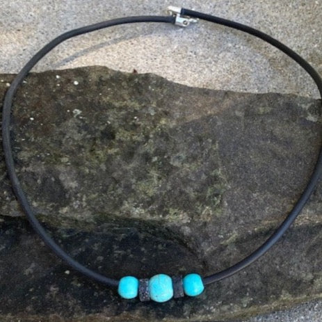 Turquoise Lava Beaded Necklace Choker, Black Rubber Choker