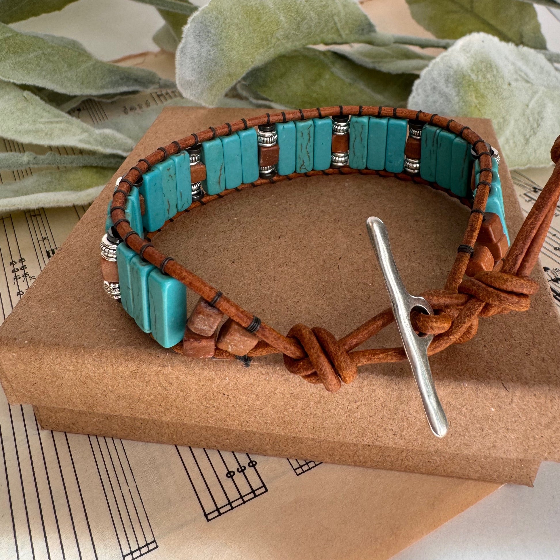 This stunning Turquoise (magnesite) beaded brown leather bracelet is adorned with Tiger Skin Jasper beads and silver accent beads, creating an eye-catching accessory. The sterling silver toggle clasp ensures a secure fit, adding a final touch of sophistication.